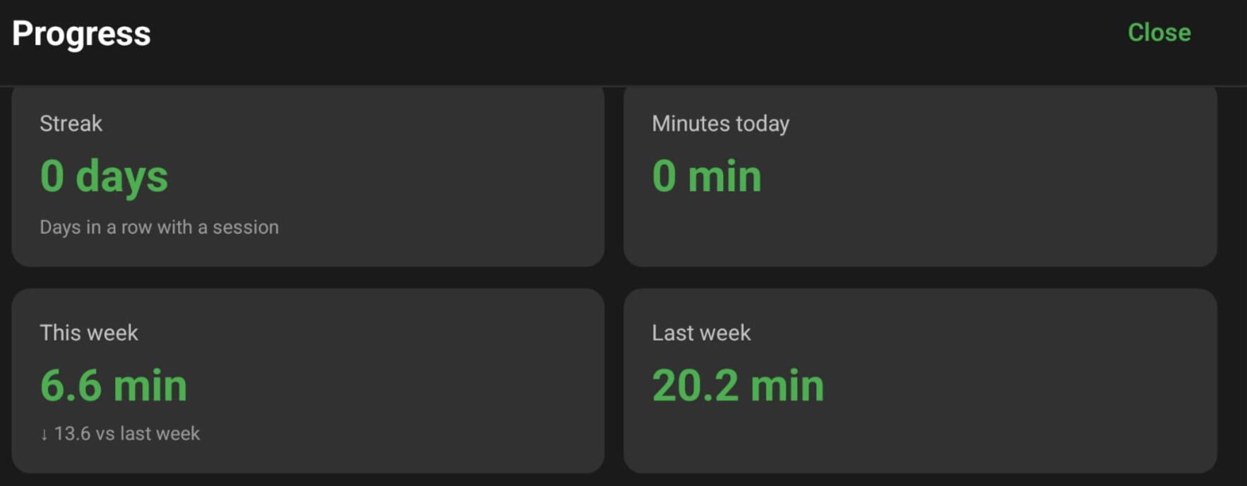 Streak, minutes today, and touches this week—all in one place. Compare to last week and hit your daily goal.